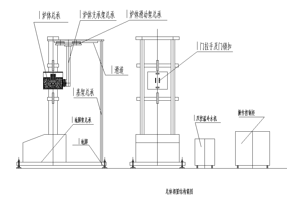 1)高溫爐體 為了讓用戶方便安全的更換試樣,采用水冷、可移動(dòng)、對(duì)開式的爐體結(jié)構(gòu)(具體見簡(jiǎn)圖1).爐體及爐蓋采用雙層不銹鋼的焊接結(jié)構(gòu),總厚度約為15mm,中空通流動(dòng)水。具有開門斷電功能。