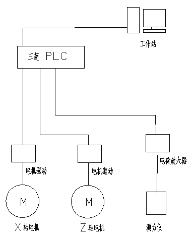 軟件系統(tǒng)由工作站、微型可編程控制器、電機(jī)驅(qū)動(dòng)器、X軸電機(jī)、Z軸電機(jī)、實(shí)驗(yàn)室多通道電荷放大器、測(cè)力儀和專用軟件組成。